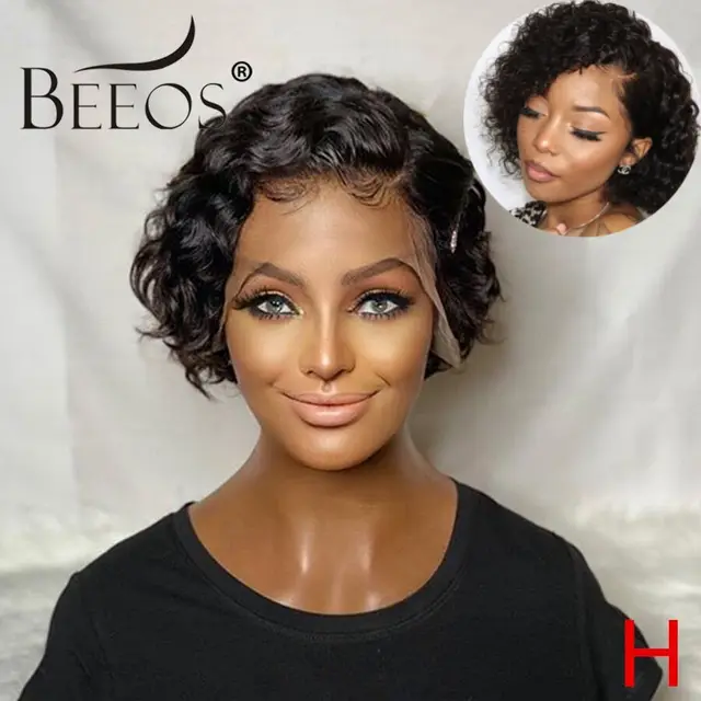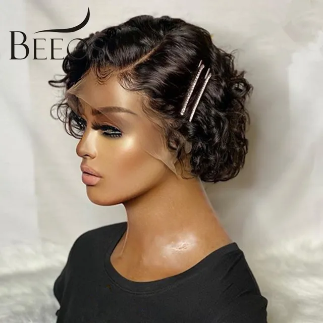 Beeos Lace Frontal Closure Wigs Pixie Cut Short Curly Wigs Brazilian Remy Human Hair Bleached Knots Pre Plucked With Baby Hair