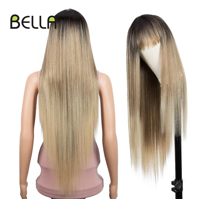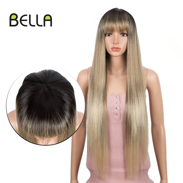 Bella Synthetic Wig Long Straight Hair Wig With Bangs Blonde Pink Purple 6 Colors Dark Root Ombre 32 inch Wigs For Women Cosplay